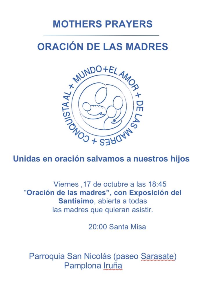 Oración de las madres abierta.Viernes 17 a las 18:45 + Añadir Google Calendar Exportación + iCal 00 días 00 horas 00 minutos 00 segundos Fecha Oct 17 2025 Hora 18:45 Localización Parroquia San Nicolás. calle de San Miguel,15,31001 Pamplona Organizador “Oración de las Madres” Navarra Compartir este evento