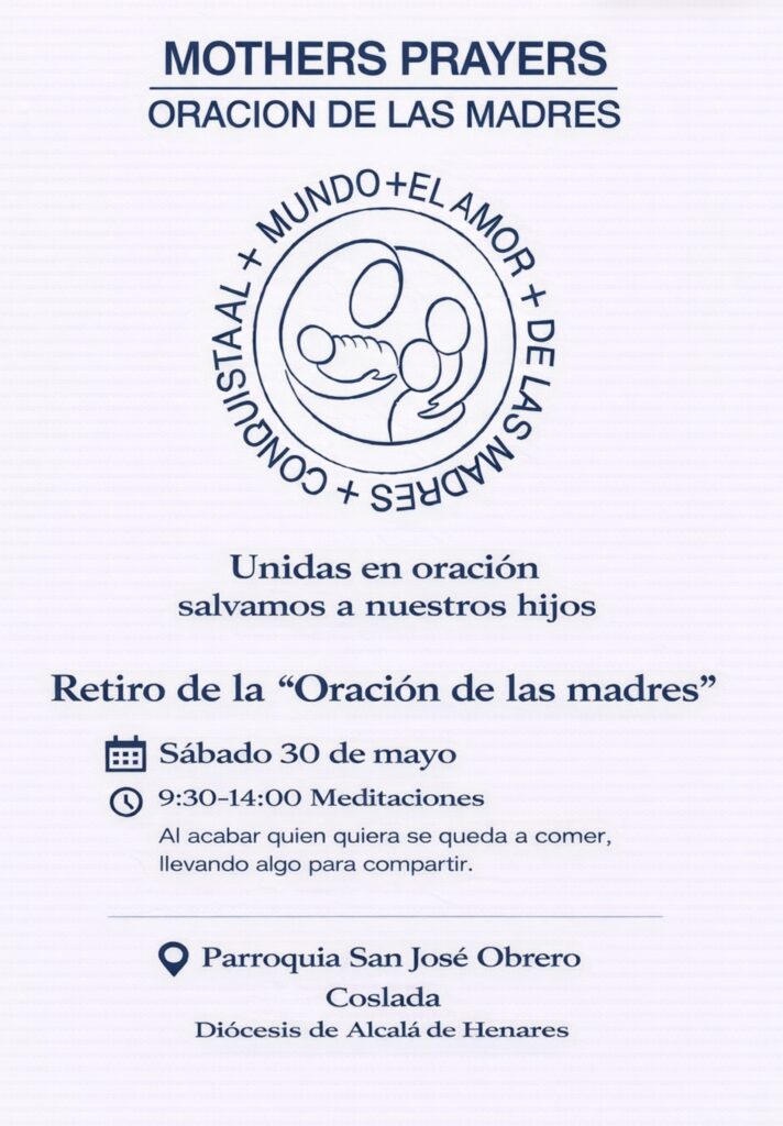Retiro, sábado 30 de mayo.Parroquia San José Obrero.Coslada Screenshot + Añadir Google Calendar Exportación + iCal 00 días 00 horas 00 minutos 00 segundos Fecha May 30 2026 Hora 09:30 Localización Parroquia San José Obrero.C.de Colombia,7,28823.Coslada.Madrid Organizador “Oración de las Madres” Diocesis Alcalá de Henares Teléfono 687 95 34 00 Compartir este evento