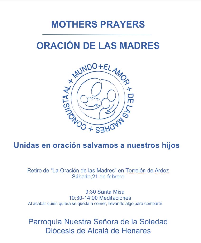 Retiro, 21 de febrero .Torrejón de Ardoz Screenshot + Añadir Google Calendar Exportación + iCal 00 días 00 horas 00 minutos 00 segundos Fecha Feb 21 2026 Hora 09:30 - 14:00 Localización Nuestra Señora de la Soledad. C. Berlín, 14, 28850 Torrejón de Ardoz, Madrid Organizador “Oración de las Madres” Diocesis Alcalá de Henares Teléfono 687 95 34 00 Compartir este evento