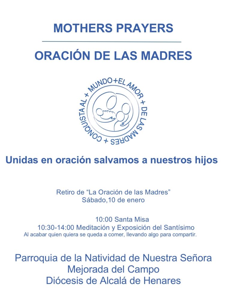 Retiro en Mejorada del Campo, sábado 10 de enero 2026 Screenshot + Añadir Google Calendar Exportación + iCal 00 días 00 horas 00 minutos 00 segundos Fecha Ene 10 2026 Hora 10:00 - 14:00 Localización Parroquia Nuestra Señora de la Natividad Av. De la Constitución,1,28840 Mejorada del Campo Madrid Organizador “Oración de las Madres” Diocesis Alcalá de Henares Teléfono 687 95 34 00 Compartir este evento