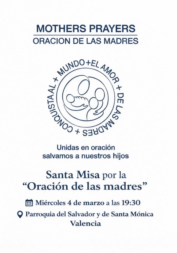 Santa Misa, miércoles 4 de marzo.Valencia Screenshot + Añadir Google Calendar Exportación + iCal 00 días 00 horas 00 minutos 00 segundos Fecha Mar 04 2026 Hora 19:30 Localización Parroquia del Salvador y de Santa Mónica.Pz de Santa Mónica,1.46009 Valencia Organizador “Oración de las Madres Valencia” Compartir este evento